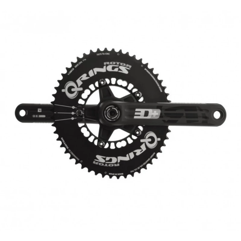 Conjunto de platos ovalados Rotor Q-RINGS Aero y bielas Rotor 3D+ ( fabricadas en aluminio 7055 mediante mecanizado CNC y con eje de 30mm ) con medidor de potencia en la biela izquierda y tecnología INpower, integrada en el eje de pedalier, quedando protegido de golpes, agua y suciedad.
